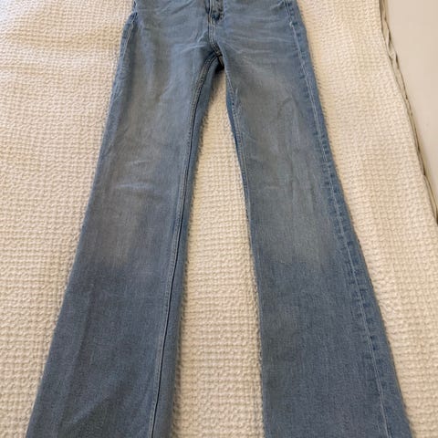 Vaaleat leveälahkeiset afends-merkkiset farkut. Vyötärö 24 tuumaa. Löysä istuvuus.