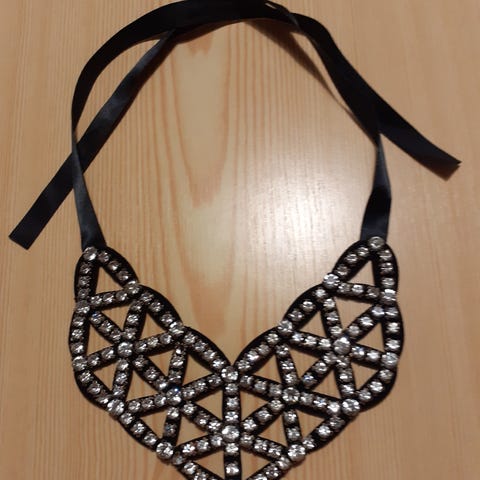 Kuvanmukainen käyttämätön kesäinen Korukolmion kaulakoru, jossa on eri kokoisia lasihelmiä kiinnitettynä viiden ohuen vaijerin ympärille.