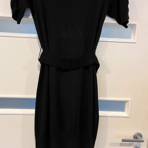 Musta - harmaa neulemekko. Laput puuttuu, mutta mielestäni merinovillaa. Ei kutita. Koko S. Pituus 96cm, kai-kai 45cm, vyötärö 40cm. Mitat venyttämättä mekon päältä.