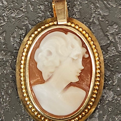 Tässä maltillisen kokoinen kultakoru, rintaan tai riipukseksi. Jäänyt minulla käyttämättä. Ajaton ja naisellinen klassikko. 14 karaatin kultaa. Koko Cameen leveys 1,8 cm ja pituus 2, 4 cm + koukun pituus 0,4cm. Camee on luonnollisesti kulumaton. Nouto tai lähetys ostajan maksamana.