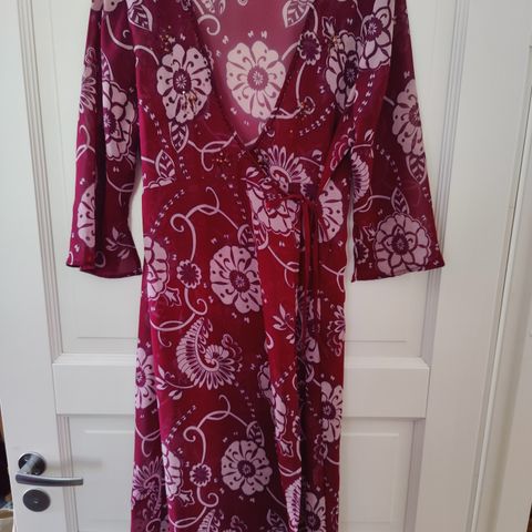 Myydään musta hihaton kietaisumekko. Kiinnitys naruilla ja kahdella napilla. Vetoketjutaskut, vyö hukkunut matkan varrelle. Koko 38. Takakappaleen pituus 90 cm.