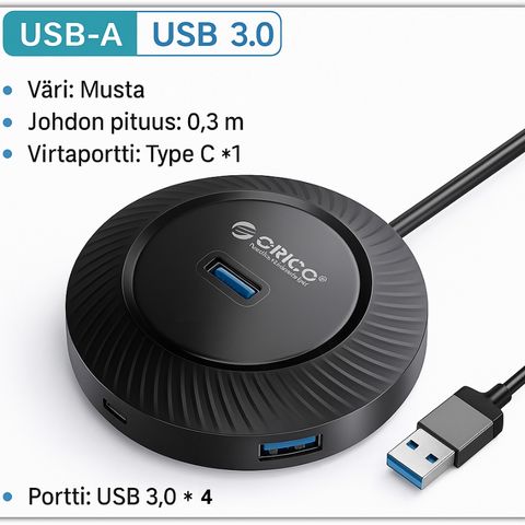 USB-keskitin voidaan liittää tietokoneeseen USB C -portin tai tavallisen USB-portin kautta erillisellä USB-sovittimella(ei mukana).