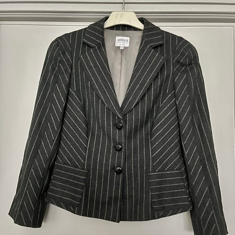 Korkealaatuinen luxusmerkin ns. smokkijakku. Villasekoite, yksi satiinipäällysteinen nappi ja satiiniset kaulukset. Italian koko 46 vastaa kokoa 40, mitat kainalosta kainaloon 52 cm ja olka helma 63 cm. Käyttämätön, OVH 450€.