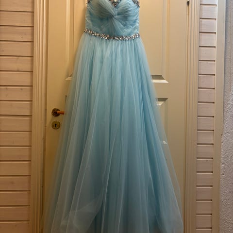 Sähkönsininen / sininen näyttävä Zazabella, vanhojentanssimekko koko 36, yläosaa ommeltu vähän tyköistuvammaksi, voi tarvittaessa purkaa. Sopii noin 165cm pituiselle. Käyttäjän vyötärö noin 70cm