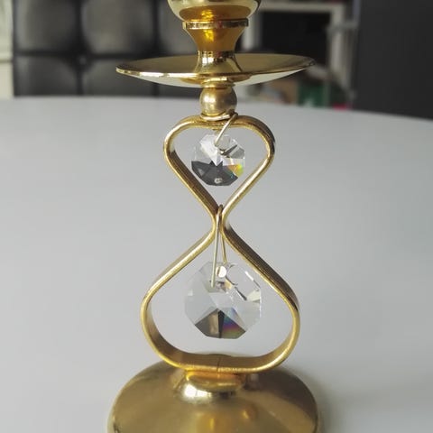 Turun kristallin kullattu, kaksihaarainen kynttilänjalka kynttilöineen.