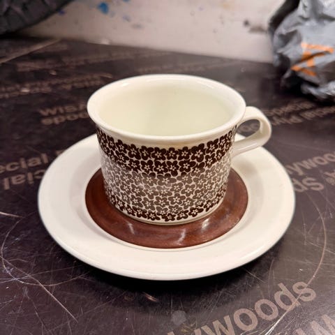 Hakusanoja: kuppi, kahvikuppi, kahvikupit, tassi, asetti, asetit, retro, vintage, ruskea kukka, ruskeakukka, ruskeakukkainen, pikkukukka, Faenza, Arabia, 1970, 70-luku, ruskea, valkoinen, valkoruskea