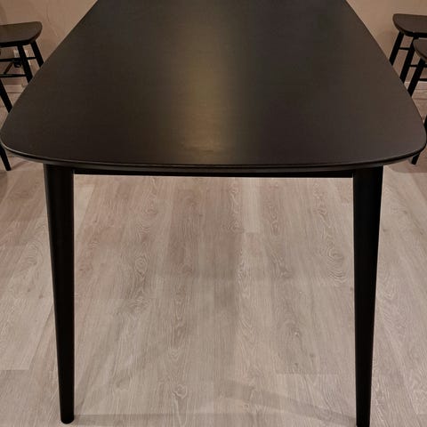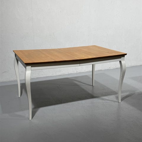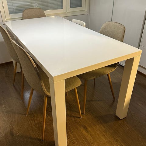 Askosta ostettu ruokapöytä, jossa korkeakiiltovalkoinen pöytälevy ja puunväriset jalat. Siistikuntoinen yleisilme, mutta paikoin pinnassa käytönjälkeä, samoin muutamassa kohdassa pinnassa pieni kolhu (kts kuvat). Jalat hyvässä kunnossa. Myydään osissa eli pöytälevy irrotettu jaloista, kaikki kiinnitysosat saa tietysti mukaan. Pöytälevy on melko painava. Pöytälevyn mitat n 95x180 cm.