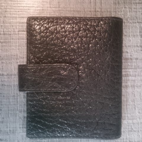 Vaaleanruskea keinonahkalompakko, ei käytetty. Koko 11 x 19 cm. Avolokeroita 5 kpl, lisäksi yksi vetoketjullinen. Korteille 4 taskua. Hihna ympäri, jolla suljetaan lompakko, painonappi, solki somisteena. Postitus tai nouto.