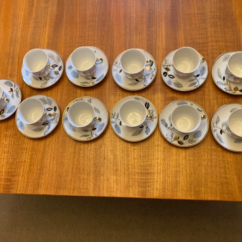 Hyväkuntoiset, pienet, riialaiset kahvi/espressokupit ja asetit Latviasta kullatuin yksityiskohdin. Ohutta posliinia. 7 kpl kahvikuppia ja 8 kpl asetteja. Kuudessa kupissa sininen leima, yhdessä vihreä. Kupin tilavuus n. 0,75 dl.