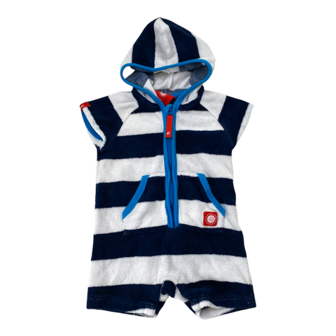 Reiman mukava froteepuku uinnin jälkeiseen lämmittelyyn. Froteeasussa on kätevä huppu ja UV-suojakerroin 50+. Täyspitkä vetoketju helpottaa pukemista, ja näppärät nepparit lahkeiden sisäsaumoissa helpottavat vaipanvaihtoa.