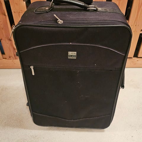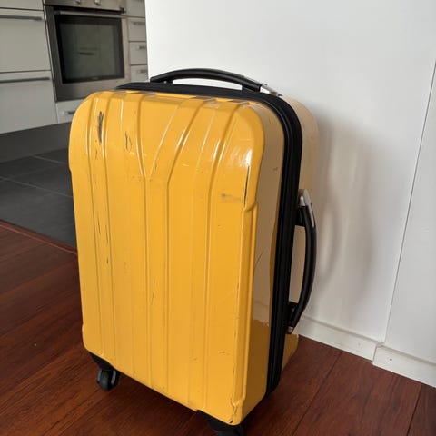 Matkalaukku, kaksipyöräinen, nostettavalla vetokahvalla. Laukku voidaan lukita erillisellä lukolla vetoketjuista (ei sisälly). Mitat pyörineen: n. 59 x 38 x 22 cm.