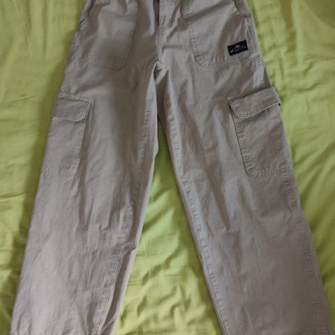 Puuvillakangasta olevat reisitaskuhousut, edessä taskut, takataskut nepparikiinnityksellä, reisitaskuissa nappikiinnitys.
