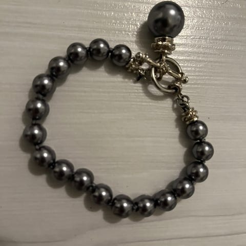 Kaksi valkoista ja yksi musta helmirannekoru.