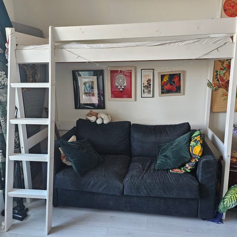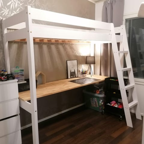 Erittäin hyväkuntoinen ja tukeva! Liikuteltava hylly alaosassa. Koko 90x200cm. Mukaan ei tule patjaa. Sängyn talo-osa ja laidat maalattu Tikkurilan maalein. Sänky kasattu ”väärinpäin”, eli käännetty. Alunperin sängyn voi asentaa vain yhden suuntaisesti. Lisänä oleva pöytä ei löydy