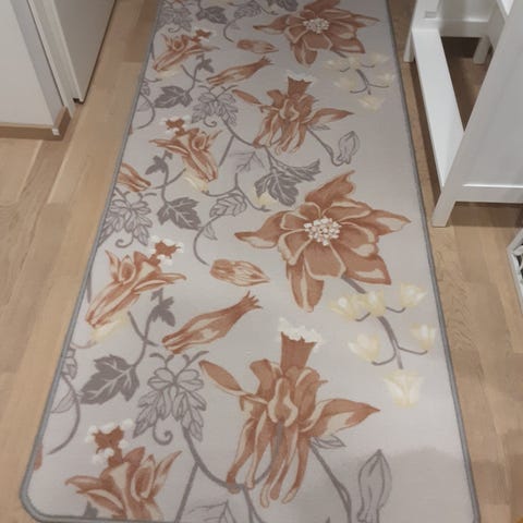 Hyväkuntoinen Vallilan käytävämatto mäntykuvioinnilla.