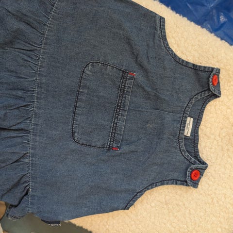 Polarn O. Pyretin farkkumekko/liivi kokoa 62cm. Olkaimissa nepparit, joten helppo pukea päälle. Kunto siisti, toisessa olkaimessa pientä rispaantumista.
