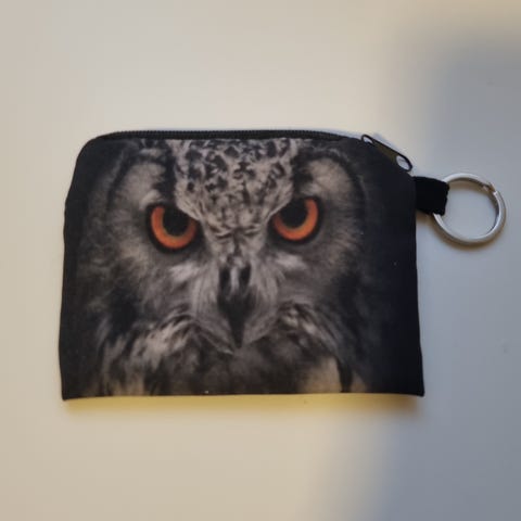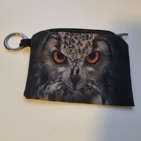 Käyttämätön, pöllö-aiheinen huovutettu vetoketjullinen pussukka.