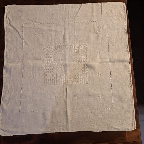 Vanha käsinkirjottu pöytäliina.