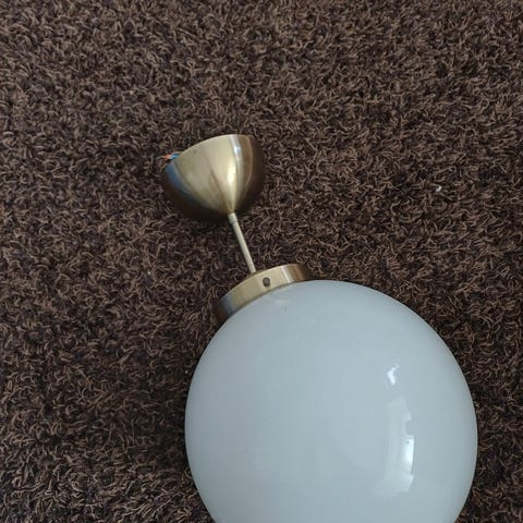 Kaunis ja hienostunut, 1970-luvun henkinen kaksikerroksinen pallovalaisin. Sisällä valkoinen alumiininen pallo ja päällä kirkas muovinen pallo. Liitetään töpselillä. Ripaus retroakin. Johdon pituus n. 130cm. Sisäpallon halkaisija 15,5cm, ulkopallon 24,5cm.