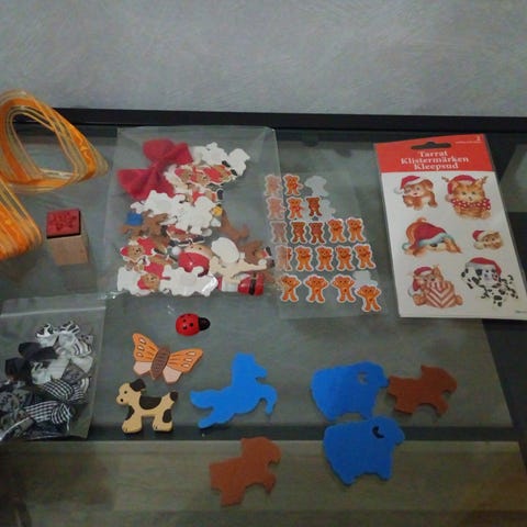 Erilaisia askartelutarvikkeita skräppäykseen, korttien tekoon, ompeluun jne.