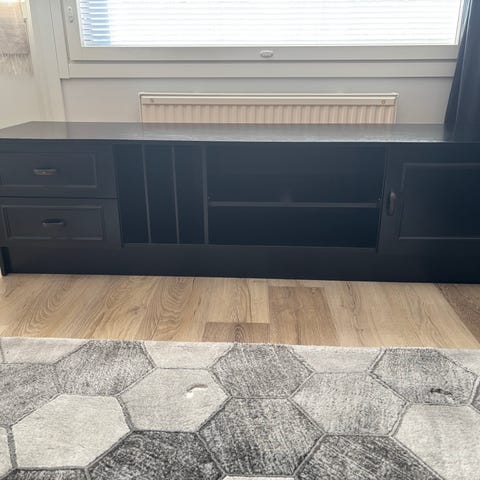 Siisti itämainen TV-taso tai johonkin muuhun tarkoitukseen, 2 vetolaatikkoa ja 2 sivuhyllyä lasiovilla. Reikä keskellä johdoille. Vasemman lasioven alakulmassa pieni särö mutta melkein huomaamaton. Painava=lue tukeva!! Mitat: lev. 120cm, syv. 50cm, kork.70cm. Kuljetusmahdollisuus pientä korvausta vastaan.