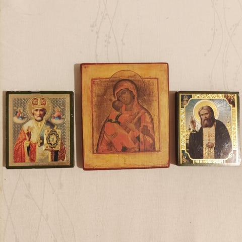 Myynnissä kehystetty ikoni, lasi halki, hinta 5 euroa
