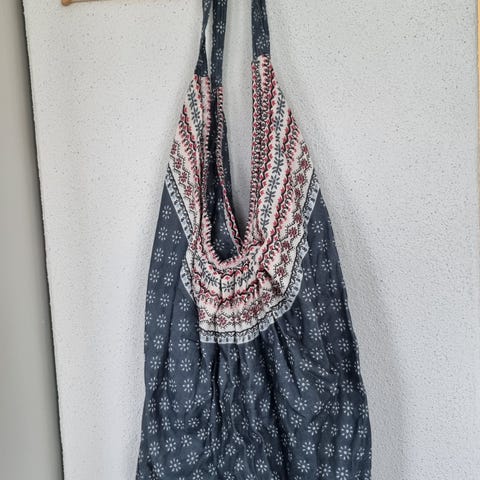 Myynnissä musta kangaskassi, mustilla kiristysnyöreillä, kantonaruilla, hinta 2 euroa