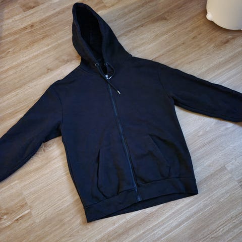 Musta, ”karvavuorinen” Maigetu-merkkinen huppari, 100 % polyesteriä, koko L. Voin lähettää.