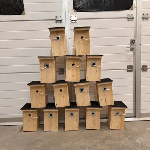 Myydään itsetehtyjä helmipöllön pönttöjä.
