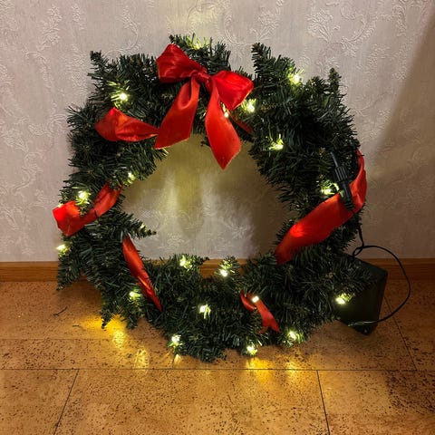 Pörröinen neulekranssi uusilla ledvaloilla, väreinä viininpunaista, lilaa ja valkoisia helmiä. Muhkea paperinarukranssipohja. Halkaisija n. 30 cm.