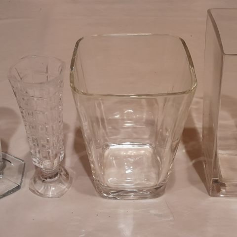 Kuva 5. Koriste-esineitä, vasemmalta kuvassa, korkeus 21 cm ja 20 cm - hinta 5 e / kpl, yhden kukan maljakko, korkeus 25 cm, hinta 10 euroa