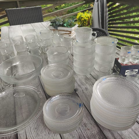 Vuosikymmeniä vanhat kotimaiset lasiastiat. Kakkulautaset 17cm, näitä 5 kpl ja kulhoja 3 kpl. Kulhon korkeus 5cm, suun halkaisija 12cm. Desing Oiva Toikka, Nuutajärvi. Kulhot uudenveroiset, lautasissa normaalia käyttökulumaa.