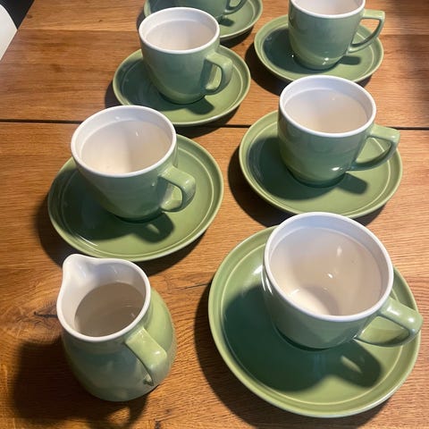 Hyvässä kunnossa olevat Kermansavi Oliivi kahviastiasto 4 kpl kuppi ja tassi.