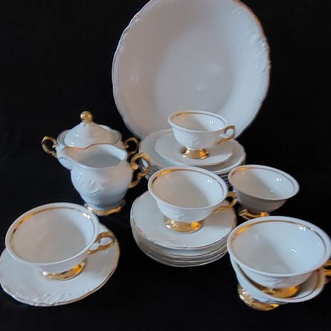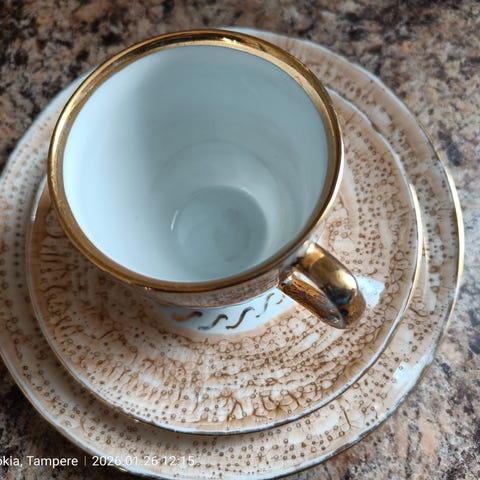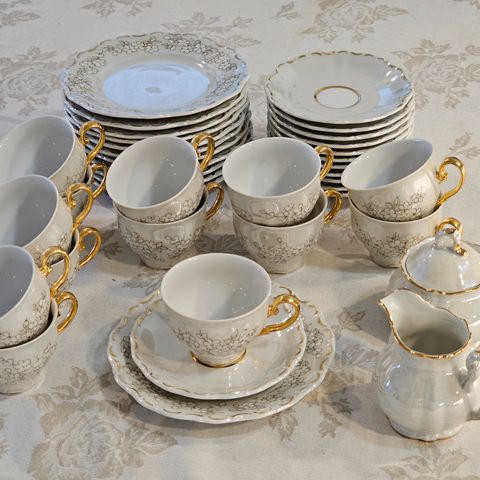 Käsin maalattu, käyttämätön kahvikalusto kuudelle hengelle. Ehjiä kaikki osat.