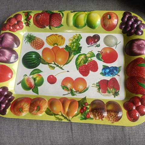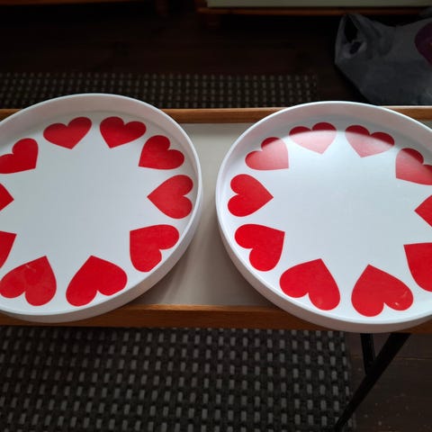 Hyväkuntoinen pieni vanha melamiinitarjotin, jossa sydänkuvio. Halkaisija noin 20cm.