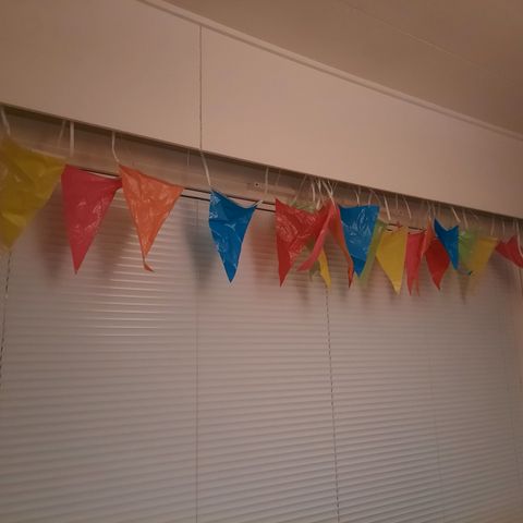 Nauhassa 9 lippua, joiden kork. 9cm ja 13,5cm, viirin kokonaisuuspituus noin 148cm.