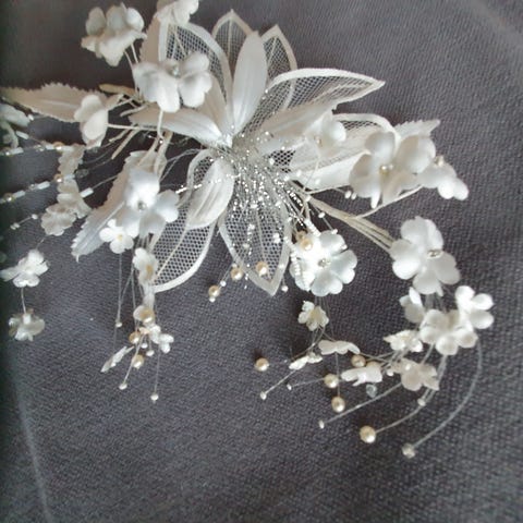 Yläselkä pituinen. Kampakiinnitys. Sopii ihanasti esim nude tms pohjaisen häämekon kanssa. Voin postittaa kuluja vastaan.
