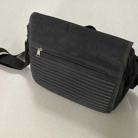 Olkahihnan sivussa on pystytasku tarrakiinnityksellä, korkeus noin 13 cm ja leveys noin 6 cm.