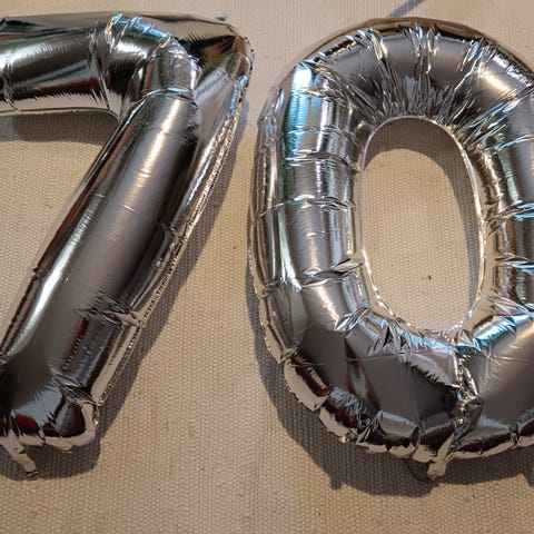 Isot hopeanväriset 7 ja 0 numero ilmapallot. Ilmaa voi lisätä pumpulla tai tyhjentää kokonaan. Korkeus 70cm. Hyvä kuvausrekvisiitta juhlakuviin. Nouto. Ovh 13e/kpl