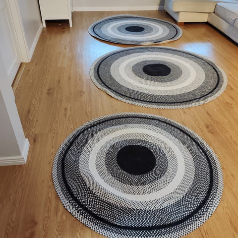 Pyöreä nahkamatto. Alapuoli kangasta. Kukkakuva, halkaisija 90 cm