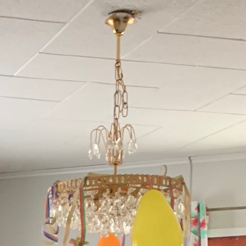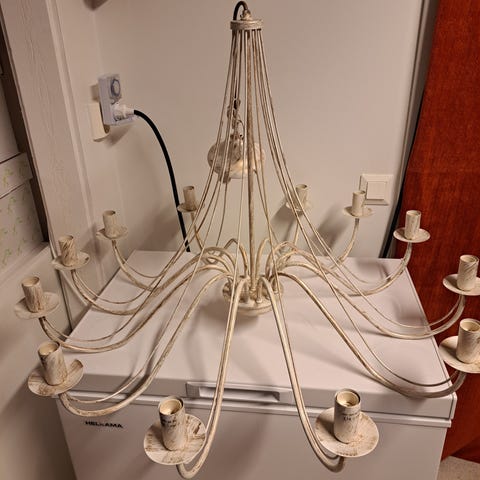 Vanha kattokruunu korkeus noin 80 cm halkaisija noin 40 cm. Valaisin antiikkia, valaisimessa / varjostimissa korjattavaa.