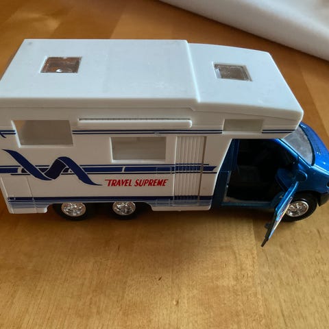 Lelu asuntoauto. Irroitettava katto. Mukana pyörä ja retkituolit. Useampia avattavia luukkuja. Keräilijöille, karavaanareille tai lasten leikkeihin.