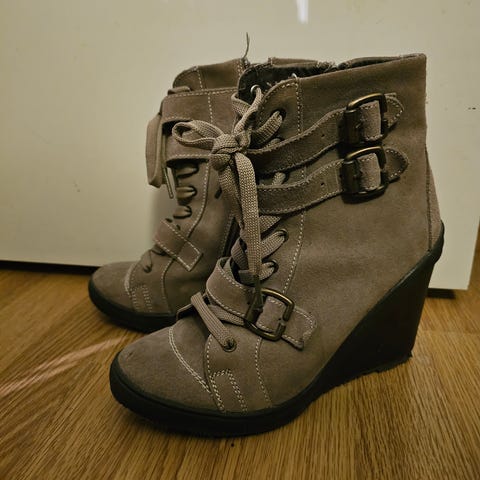 OK-Kenkä Oy:n Suomessa valmistetut Noora-kiilakorkokengät, nahkaa, koko 37,5. Koron korkeus 5 cm. Sisäpohjan painatus kulunut mutta muuten kegät ovat ehjät ja siistit.