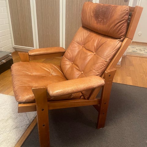 MYYTYEsko Pajamiehen suunittelema koivutaru-nojatuoli 70-luvulta. Verhoilu nahkaa. Nahassa jonkin verran iän tuomaa käyttökulumaa.