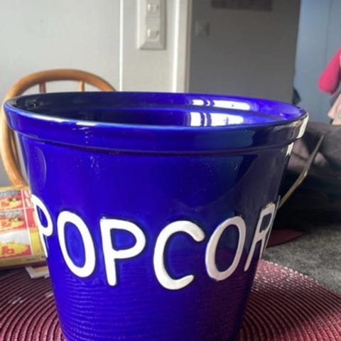 Myydään ok-kuntoinen sininen popcorn-kulho. Yläreunassa tiskikoneessa tulleita pieniä lommoja, muuten ehjä. Suuaukon halkaisija vajaa 23 cm. Korkeus n. 19 cm.