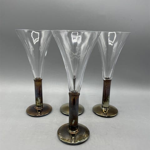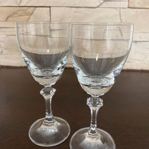 Komea setti vanhoja viinilaseja, joissa on toisella sivulla kaunis kuvio.