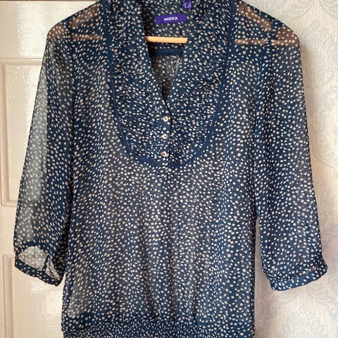 Paita, polyesyeria, tummansininen ja valkoisia palloja, edessä nauhat.