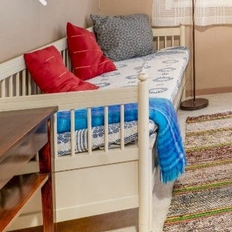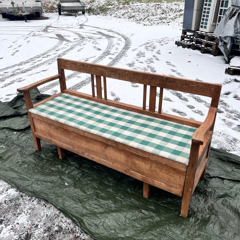 Levitettävä puinen sohva patjalla. Sisällä säilytystilaa.
