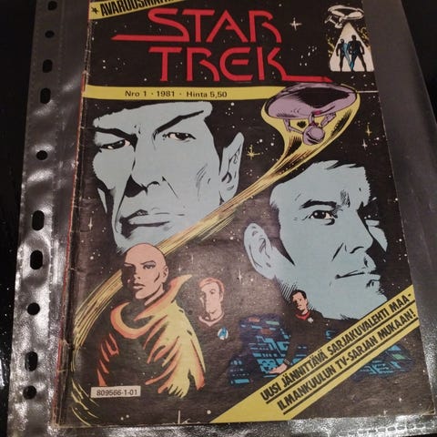 Kohtuukuntoinen Avaruusmatka Star Trek-sarjakuvalehti nro 1 vuodelta 1981. Kansissa kulumaa ja pieni repeämä, sivut ehjät ja kiinni, sivuilla 3-12 pientä tahraa.