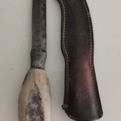 Vanha puukko, puukahva jossa kaiverrus, nahka tuppi, (huom. kuvassa tummunut, ei puhdistettu), terä 10cm terävä.